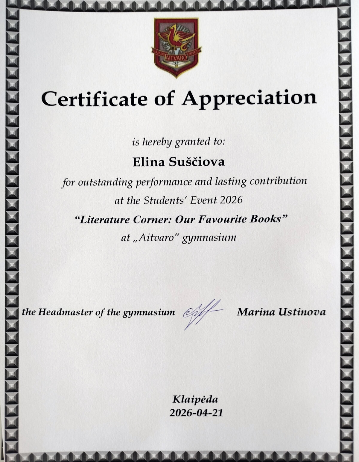 Balandžio 21 dieną ,,Aitvaro" gimnazijoje įvyko miesto konkursas "Literature Corner.My Favourite Book".Jame dalyvavo ir Pajūrio progimnazijos 8c klasės mokinė Elina Suščiova. Mokiniai anglų kalba pristatė savo mėgstamas knygas, dalijosi įspūdžiais ir rekomendacijomis. Dalyviai parodė kūrybiškumą, geras kalbos žinias ir meilę literatūrai. Konkursas parodė, kad skaitymas plečia akiratį, lavina kalbinius įgūdžius ir skatina domėtis pasauliu. Todėl labai svarbu skaityti knygas ir ugdyti meilę literatūrai.
