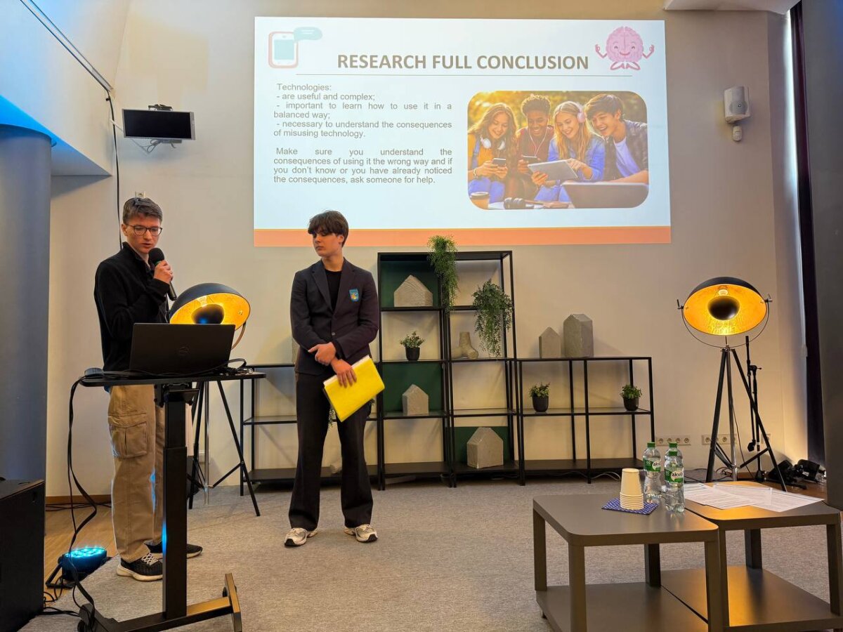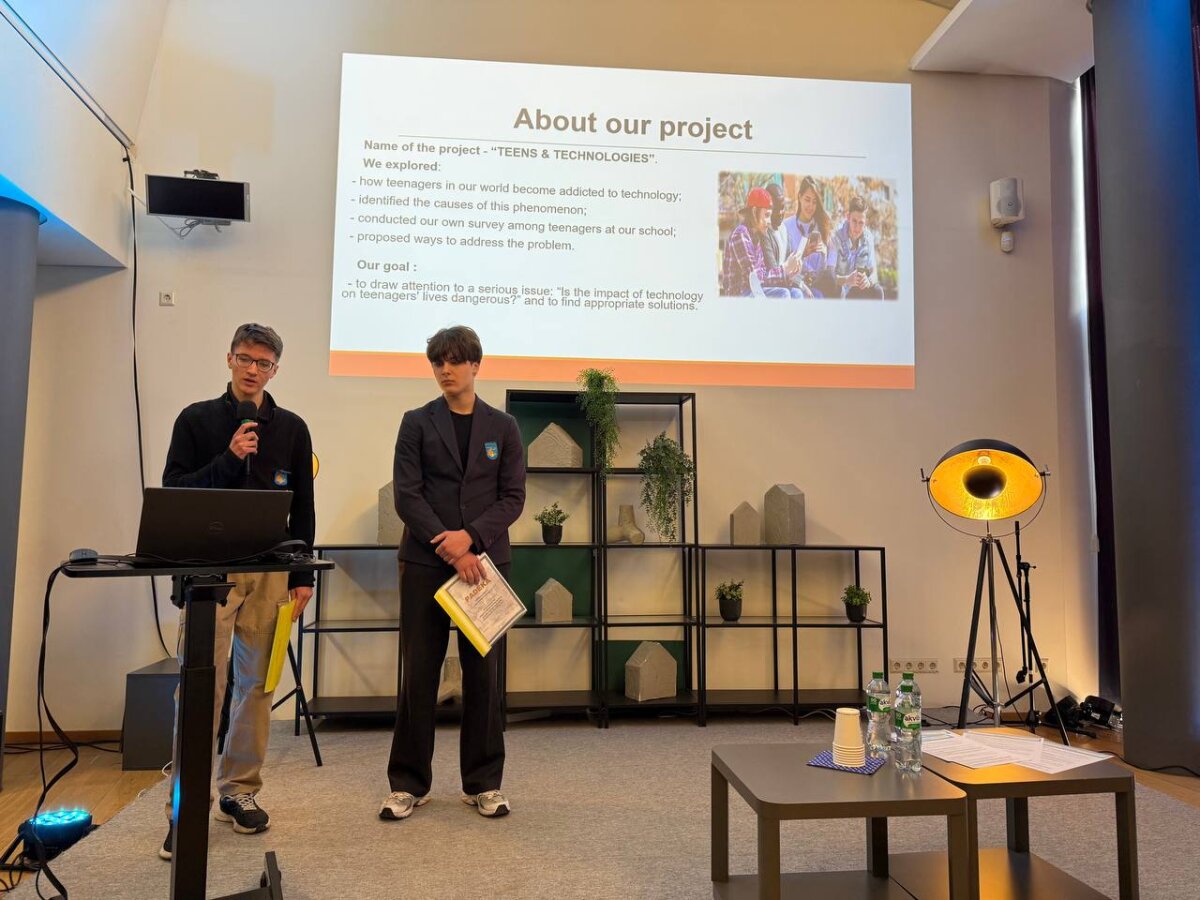 Konferencijoje dalyvavo du mūsų 8b klasės mokiniai Valerii Feshchenko ir Mark Muravjov, kurie pristatė savo tyrimą tema „Paaugliai ir technologijos“. Mokiniai kartu su anglų kalbos mokytoja Nadiia Debretseni atliko apklausą, išanalizavo gautus rezultatus, išskyrė pagrindines problemas ir pasiūlė galimus sprendimo būdus. Pristatymo metu jie pademonstravo gebėjimą aiškiai ir argumentuotai reikšti mintis anglų kalba.