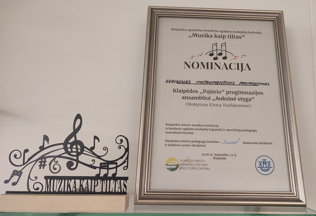 2026 m. balandžio 21 d. mūsų mokyklos gitaristų ansamblis "Auksinė styga" dalyvavo Klaipėdos apskrities bendrojo ugdymo mokyklų festivalyje "Muzika kaip tiltas", Prano Mašioto progimnazijoje. Renginį organizavo Klaipėdos miesto pedagogų švietimo ir kultūros centras kartu su muzikos mokytojų bei logopedų ir specialiųjų pedagogų metodinių būrelių tarybomis.